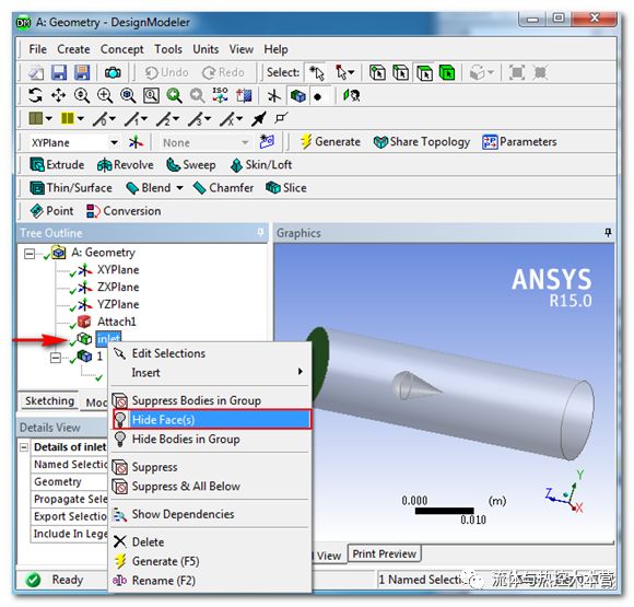 此时,树目录中就多出一个inlet的面,并且inlet前面的黄色闪电图标变成了绿色打钩,表示命名操作成功。然后鼠标右键单击inlet,选择并单击Hide Face(s)。