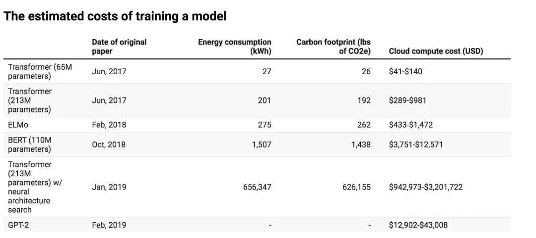结果显示,训练的计算环境成本与模型大小成正比,然后在使用附加的调整步骤以提高模型的最终精度时呈爆炸式增长,尤其是调整神经网络体系结构以尽可能完成详尽的试验,并优化模型的过程,相关成本非常高,几乎没有性能收益。BERT 模型的碳足迹约为 1400 磅二氧化碳,这与一个人来回坐飞机穿越美洲的排放量相当。