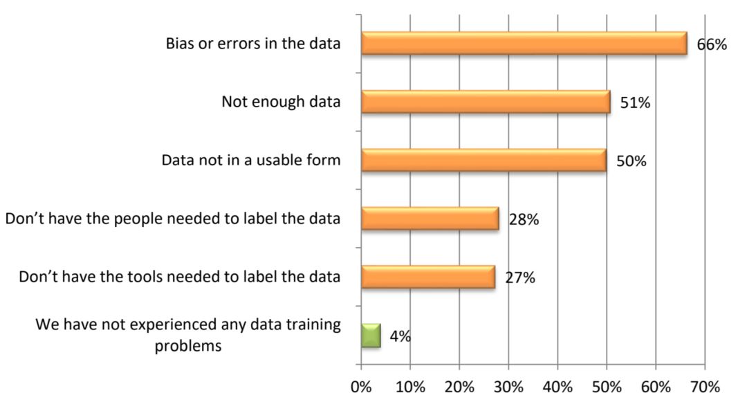 与数据相关的机器学习成本主要表现在数据集方面,包括数据集的获得、数据的标注等。Dimensional Research 代表 Alegion 所做的一项 最新研究 表明,所有组织中的 96%都遇到了与训练数据质量和数量相关的问题。同一项研究表明,大多数项目需要超过 100,000 个数据样本才能表现良好。