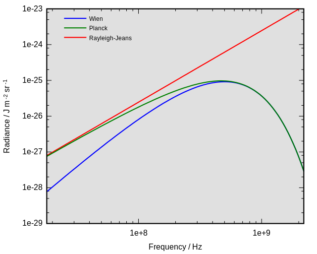 式中c是光速,C1、C2是待定参数。在一定的参数选择下,公式与黑体辐射实验数据符合得很好。