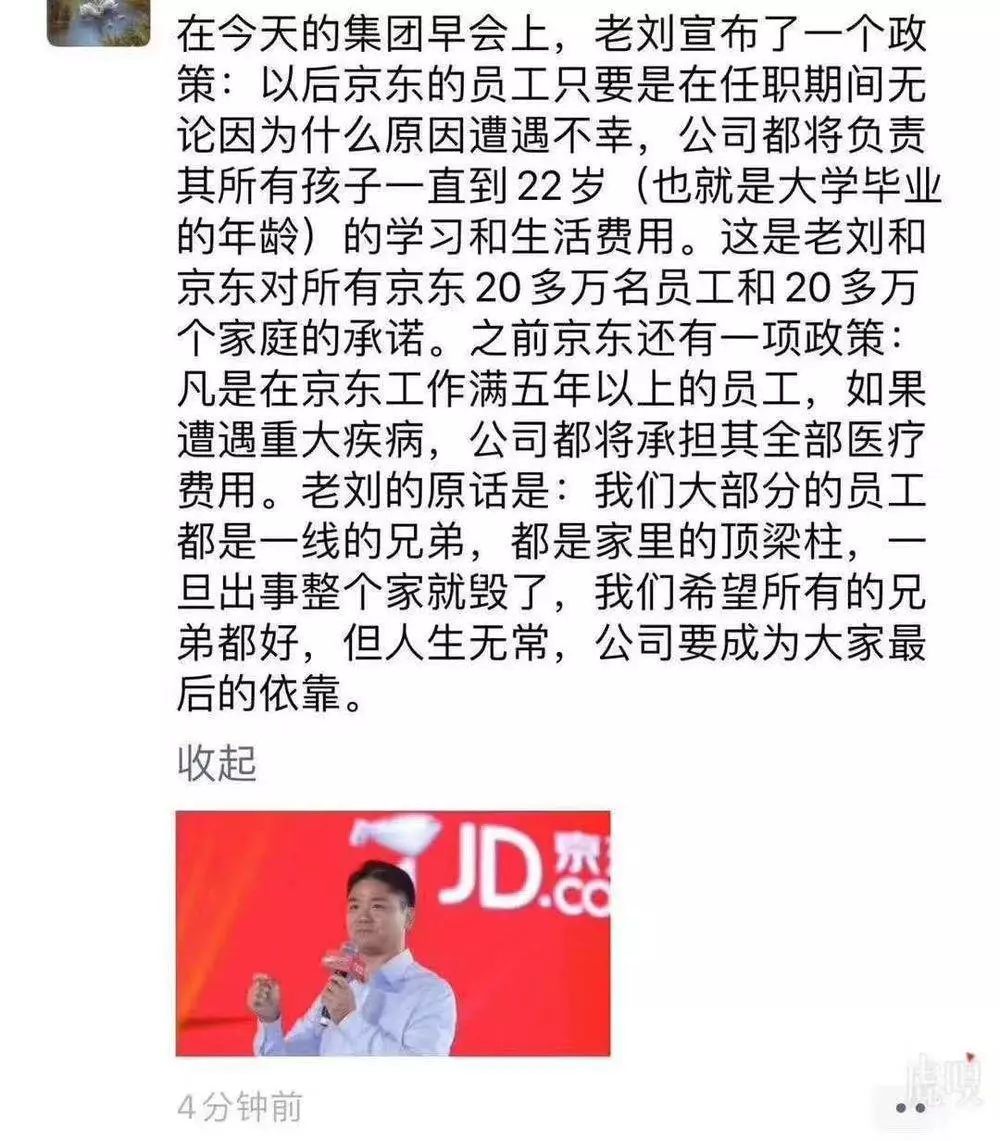 刘强东在25日集团早会上表示,“我们大部分的员工都是一线的兄弟,都是家里的顶梁柱,一旦出事整个家就毁了,我们希望所有的兄弟都好,但人生无常,公司要成为大家最后的依靠”。刘强东为什么会突然发布这一政策,其中缘由外界不可得知,不过目前网易裁员一事引起热议,不排除刘强东是受网易事件启发所做的决定。