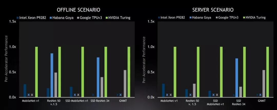 集MLPerf Inference v0.5,目前该版本还不太完善,也没有功耗测试指标,但仍然吸引了主要芯片公司的关注。