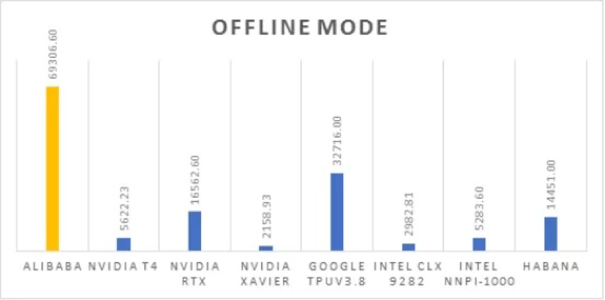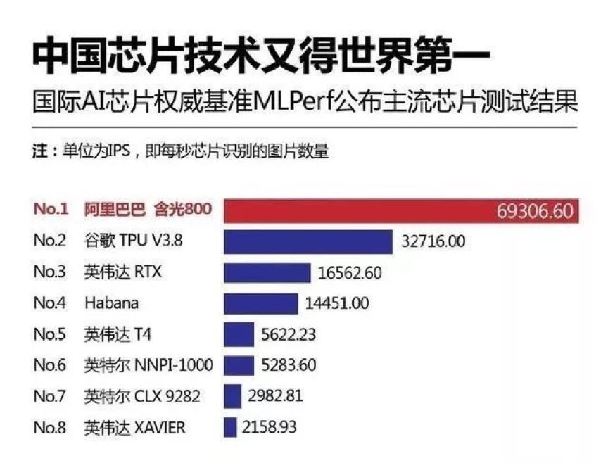 中,“含光800”芯片的成绩是69306.60 image/sec,位居全球第一,排名第二的