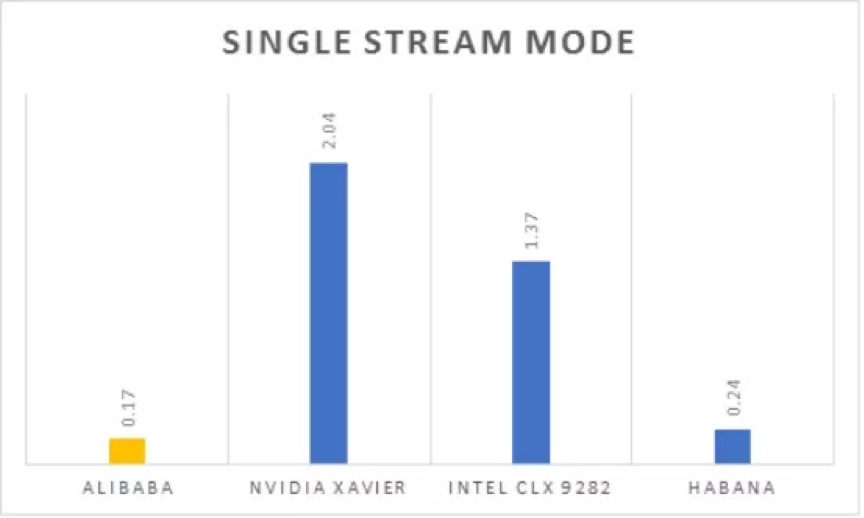 中,“含光800”的成绩是0.17毫秒,比第二名Habana的Goya快1.41倍。