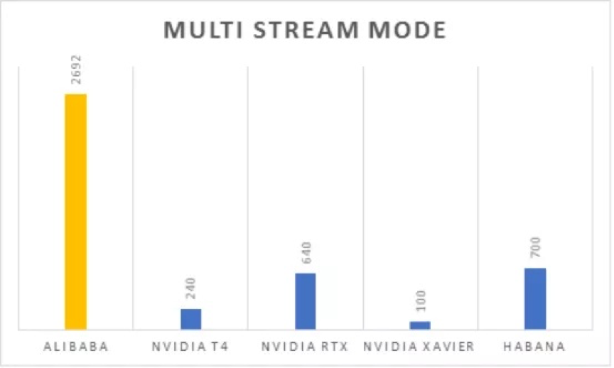 中,“含光800”最大可同时处理2692路视频流,是第二名Habana Goya的3.84倍。