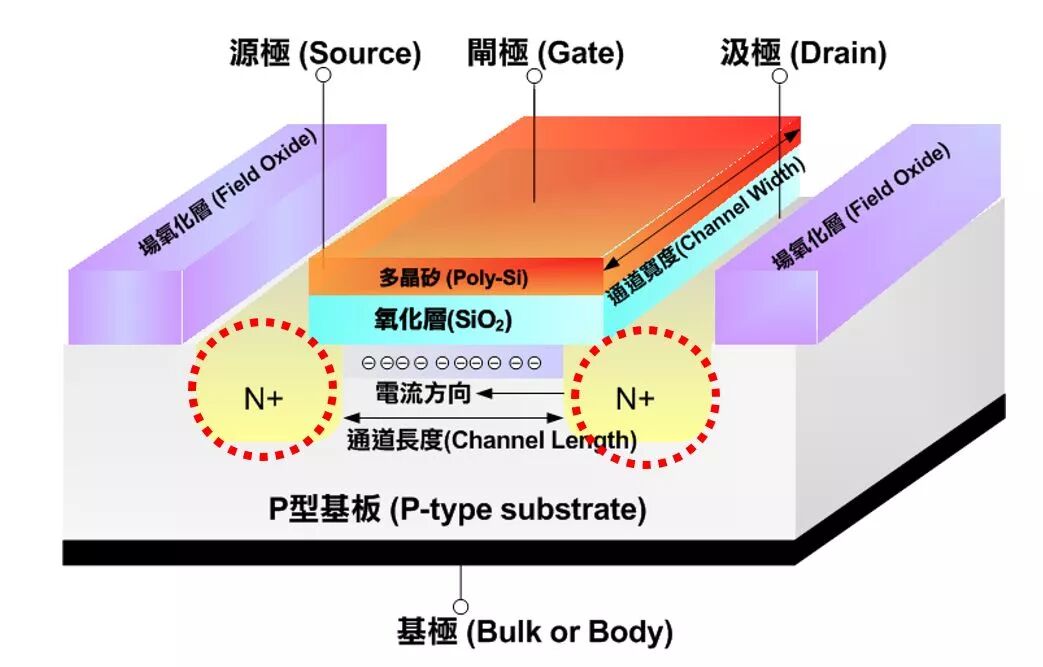 当一个正电压施加在栅极上,带负电的电子就会被吸引至表面,形成沟道,让N型半导体的多数载流子—电子可以从源极流向漏极。
