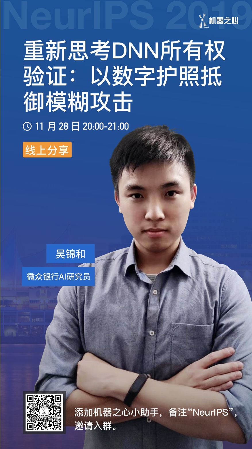 本届 NeurIPS,机器之心为读者们精心策划了 NeurIPS 2019 专题,包括线上分享、论文解读、现场报道以及线下活动等。这是机器之心 NeurIPS 2019 线上分享的第三期,我们邀请到了微众银行 AI 研究员吴锦和为我们分享主题:重新思考 DNN 所有权验证:以数字护照抵御模糊攻击。