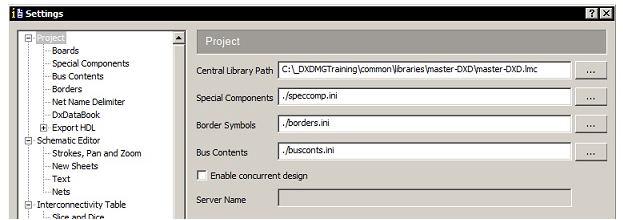 ▶ 使用模板创建新项目之后,在Setup > Settings >项目下,验证您的中心库、总线内容和特殊组件设置都指向正确的位置。