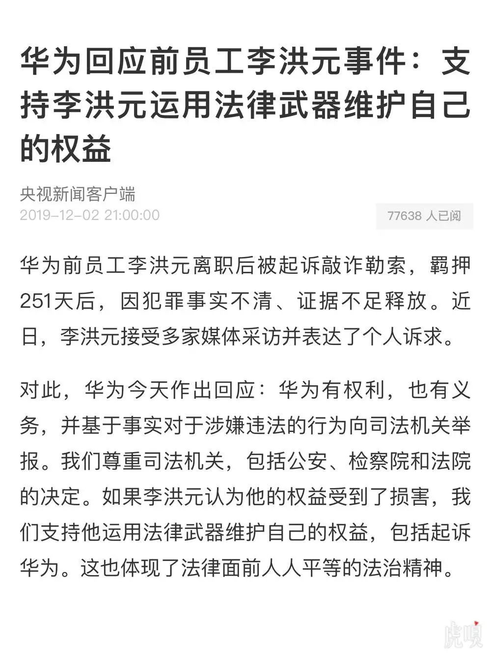 围绕华为前员工李洪元因离职赔偿金问题遭遇251天拘留一事的舆论持续发酵,华为12月2日做出正式回应:“我们尊重司法机关,包括公安、检察院和法院的决定。如果李洪元认为他的权益受到了损害,我们支持他运用法律武器维护自己的权益,包括起诉华为。这也体现了法律面前人人平等的法治精神。”