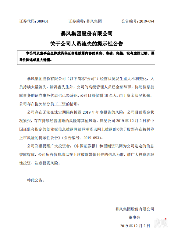 @虎嗅【暴风集团:公司目前仅剩10余人,拖欠部分员工工资】暴风集团发布公告称,公司经营状况发生重大不利变化,人员持续大量流失,除冯鑫先生外,公司的高级管理人员已全部辞职,协助信息披露事务的证券事务代表也已经辞职,公司目前仅剩10余人。由于资金状况紧张,公司存在拖欠部分员工工资的情形。