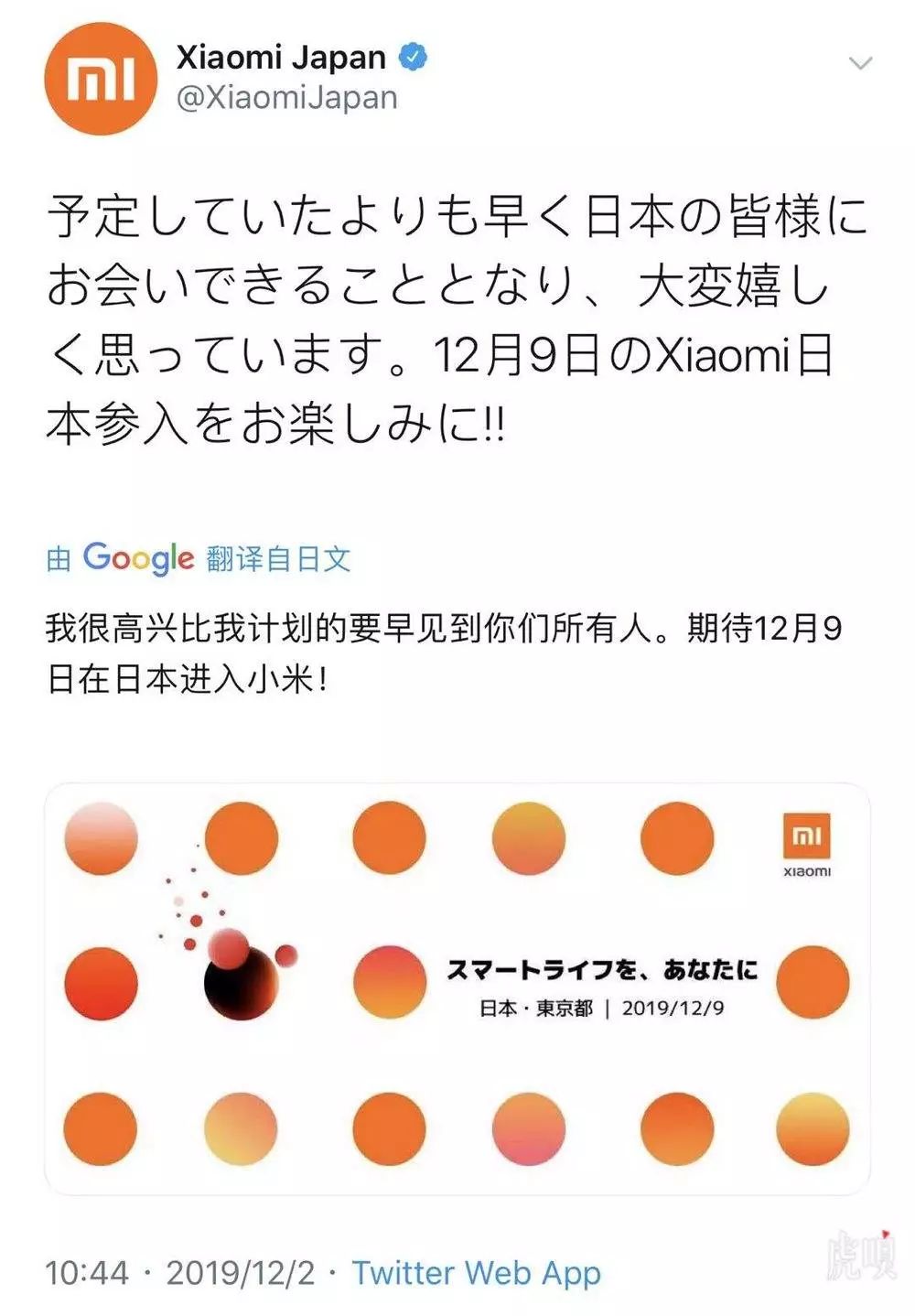 @虎嗅【小米宣布12月9日进入日本市场,召开首次发布会】小米日本官方Twitter今日宣布,将于12月9日进入日本市场,并举行首场发布会。