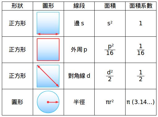 如果用周长“p”作为线段,则面积为 p² /16,面积系数为1/16;