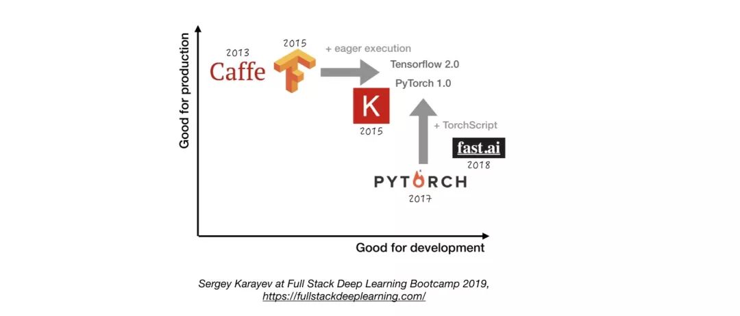 除非有充分的理由不这样做,否则请使用 TensorFlow/Keras 或 PyTorch。下图显示了不同框架在开发和 生产方面的比较。