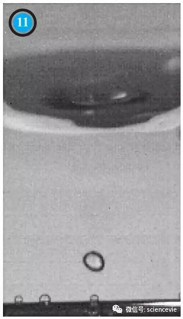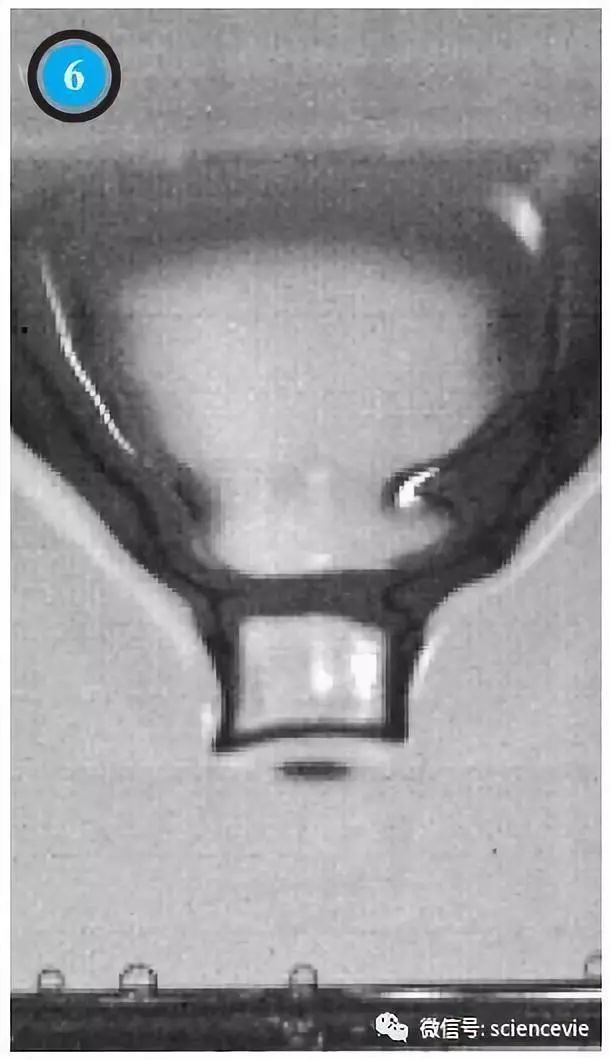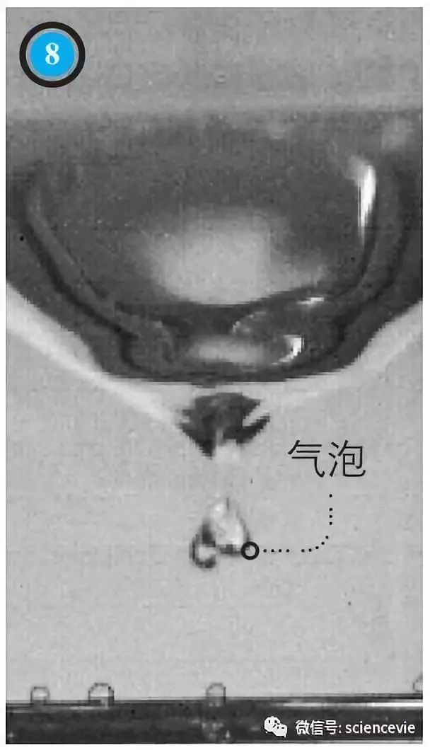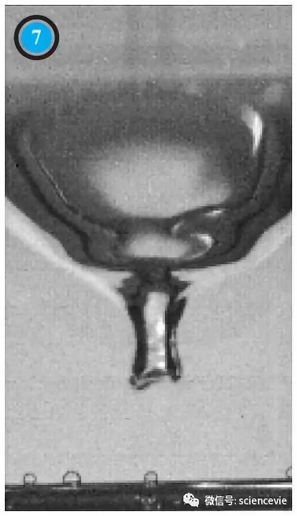 因为水的表面有点像弹片,它会暂时变形,但最终会恢复初始状态。只不过在空腔逐渐消失的时候(图7),