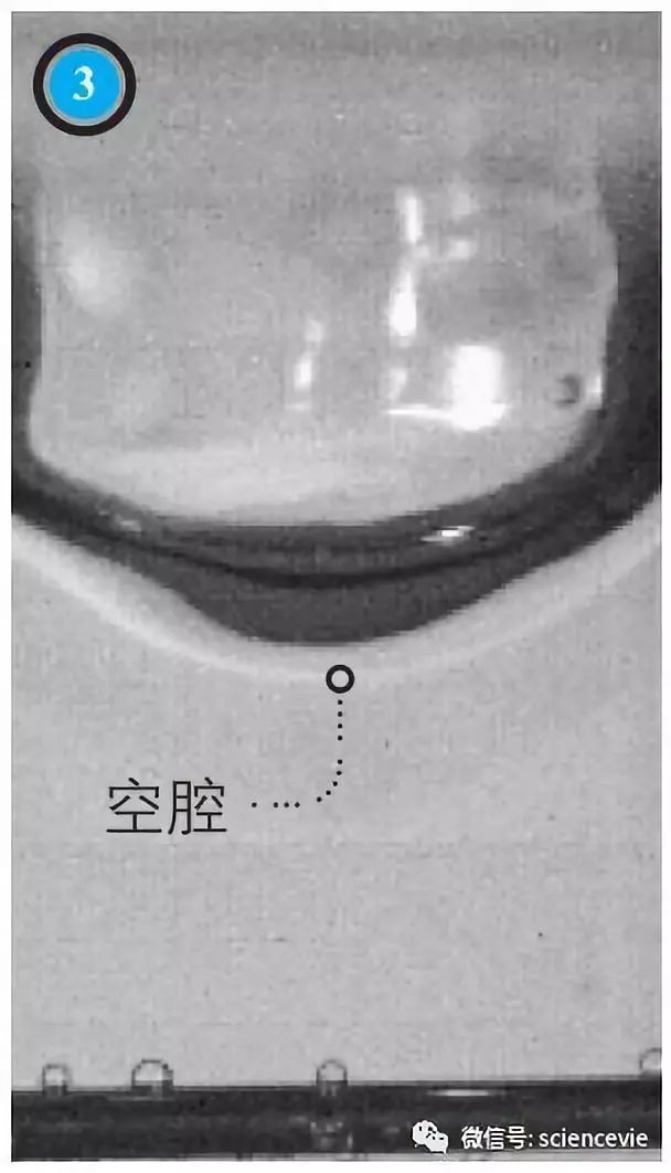 当水滴到达水槽的水面时,冲击使得一个空腔(图2)出现。