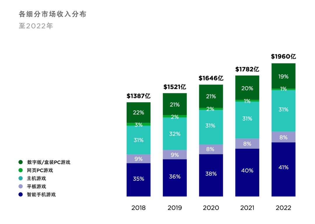 据 Newzoo 预测,2018 到 2022 年,移动游戏会保持强劲的增长速度,挤压 PC 游戏的市场份额,但主机游戏不会收到影响,未来几年都会在全球的游戏市场中占据超过三成的市场份额。