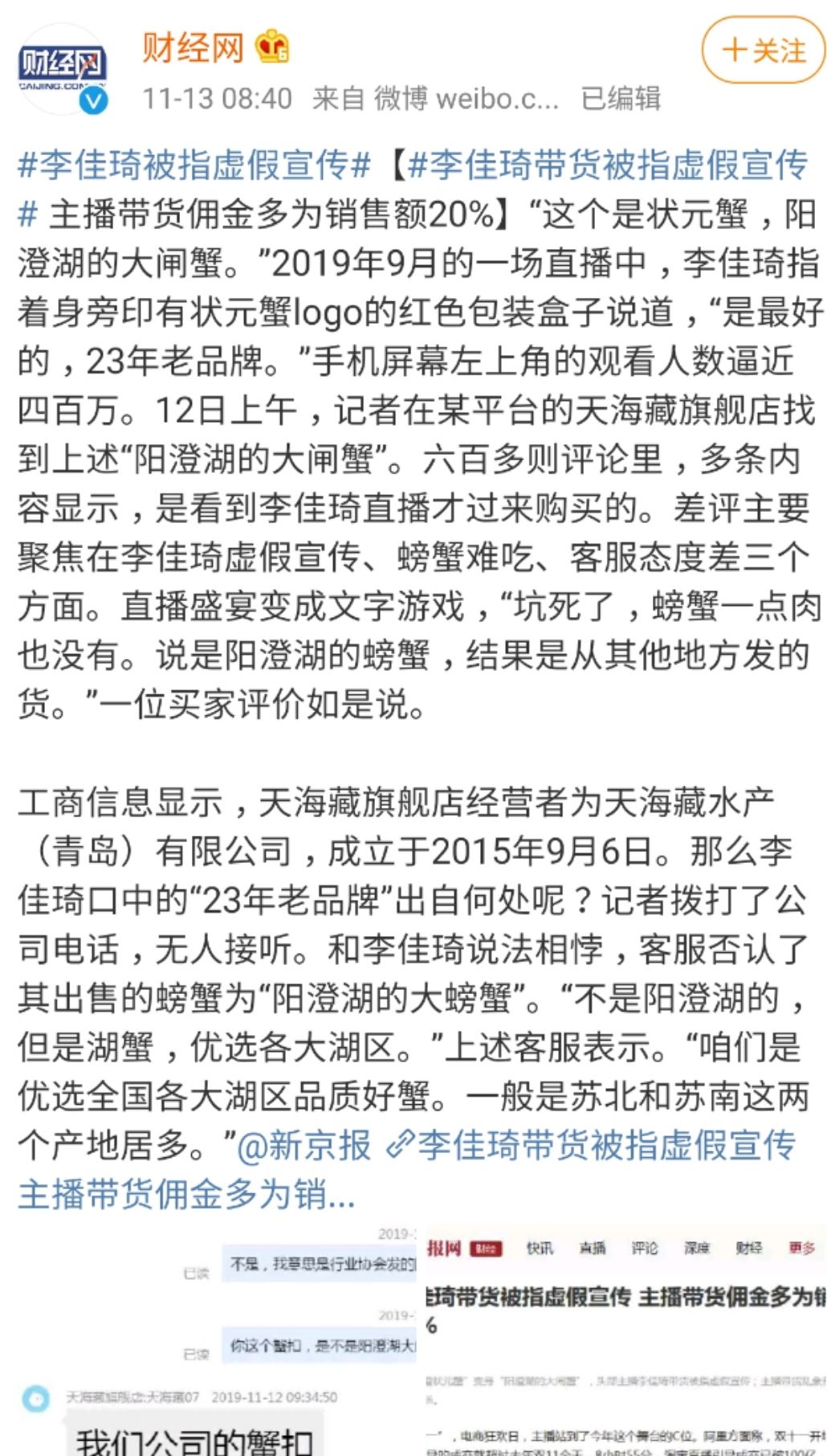 “不粘锅事件”发生十几天后,又有消费者曝出李佳琦推荐的“阳澄状元蟹”并非产自阳澄湖,螃蟹既小又难吃