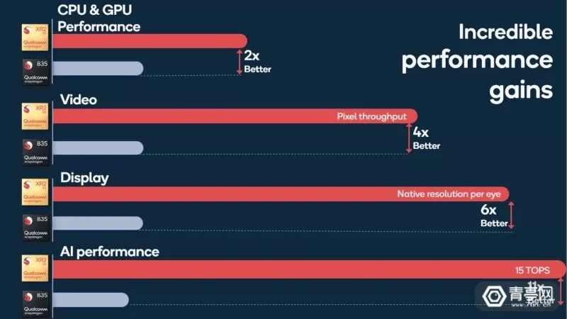 XR2定位高端很显然,虽然基于骁龙865,但并未公布XR2与865性能对比。根据历年数据,骁龙865性能约比骁龙835提升95%左右,这么算比较接近,因此性能足够。