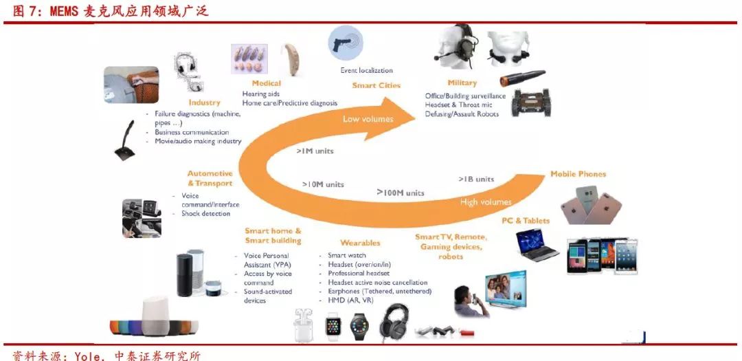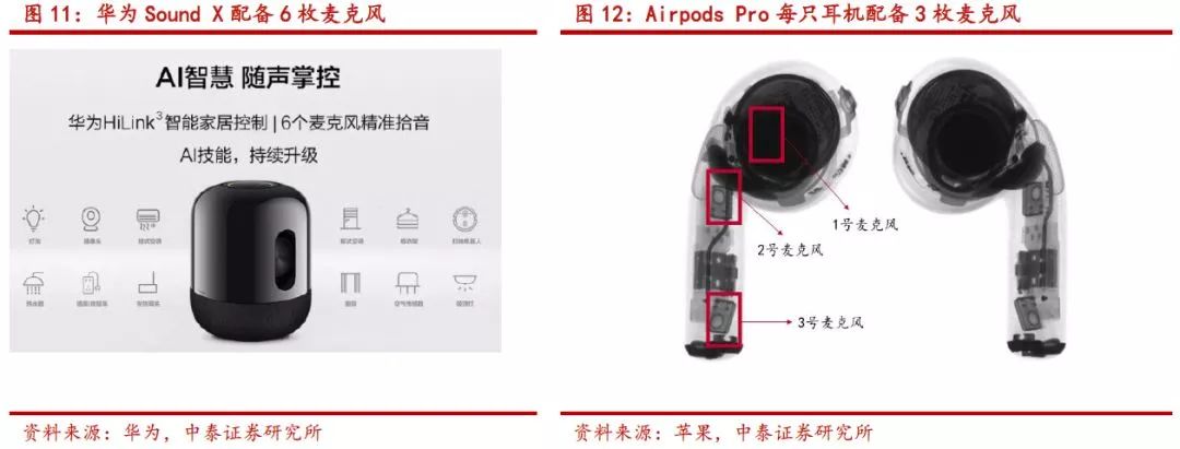 MEMS麦克风伴随智能手机的普及而快速增长,智能音箱及TWS耳机进一步驱动行业成长。MEMS麦克风轻薄化优势在智能手机时代被充分发挥,市场规模迅速扩大,而在智能手机之后,智能音箱成为又一麦克风使用大户。智能音箱作为声控指令中枢,麦克风成为必备功能配件,围绕麦克风拾音也持续进行着技术迭代,如身份及语音识别、噪音及风声排除等;因为麦克风阵列的引入,数量上也大为增加。苹果HomePod与华为Sound X音箱均搭载了6枚MEMS麦克风。TWS耳机作为重要语音控制入口,麦克风搭载量也高于普通耳机,同时由于降噪等功能的引入,也需要麦克风参与实现,如前文所述,Airpods Pro为实现降噪功能,即多增加一枚外向式麦克风以拾取环境噪声。