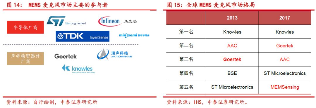 MEMS麦克风市场参与者分为半导体厂商和声学精密器件厂商。MEMS麦克风由于导入半导体工艺,使得一些半导体厂商进入市场,典型的有意法半导体和英飞凌等。其中英飞凌在 MEMS 麦克风领域主要产品为 MEMS 麦克风芯片,较少从事MEMS 麦克风的封装和测试环节,主要作为第三方供应商为众多声学精密器件厂商提供 MEMS 麦克风芯片。另一重要参与者是传统ECM声学器件厂商,如楼氏、歌尔股份、瑞声科技等,这些传统声学厂商业务广泛,主要产品除 MEMS 麦克风成品外,还包括其他声学器件、光学器件、精密设备等未采用 MEMS 技术的产品。根据IHS Markit 的数据统计,2017 年全球 MEMS 麦克风出货量排名前五的厂商分别为楼氏、歌尔股份、瑞声科技、意法半导体、敏芯股份,前五名中已经有两名中国企业,其中歌尔已经位居第二。在MEMS麦克风器件领域中国企业已经占据较高的市场份额。