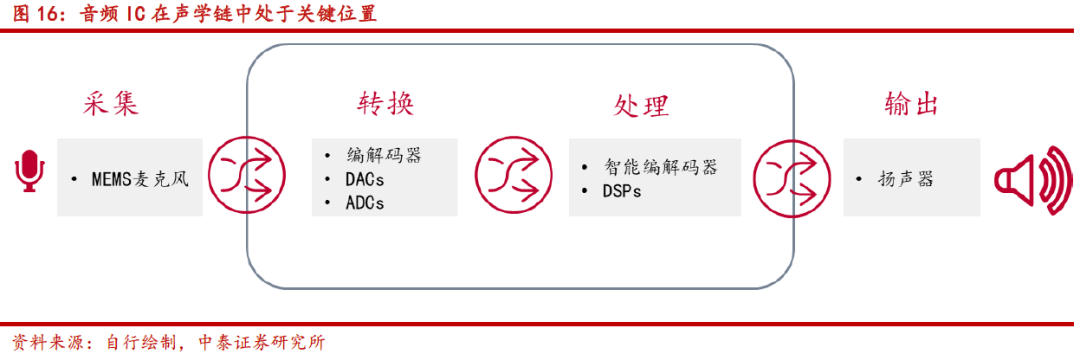 声学器件:从麦克风到扬声器。电子产品中完整的声学系统包含三部分:①采集。主要由麦克风来实现。②处理。由各类音频IC或云端来实现,如ADC、DAC、音频编码器/解码器等。③播放。主要由音频放大器(属于音频IC)、扬声器来实现。其中最主要的元器件分别是麦克风、扬声器与音频IC 。