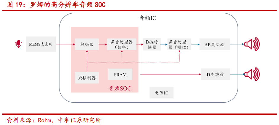 发展趋势来看,音频IC以高采样率/分辨率、高功能集成为发展方向。高采样率/分辨率:高分辨率音源已是大势所趋,而忠实再现音源信息则需要音频IC的配合才能得以实现。早期CD音质标准确定的时候(1980s),采用的是16bit分辨率、采样率44.1kHz的音频数据格式,而目前高分辨率音频标准则一般采用24/32bit分辨率、采样率192kHZ甚至更高,可处理高分辨率音源的音频解码器以及与其音质相配的声音处理器成为必须。高功能集成:音频设备小型化轻量化的需求使得音频IC走向集成化。如罗姆半导体的音频SOC BM94803AEKU,把解码器、声音处理DSP、USB/SD解码器、MCU甚至是SDRAM都集成进去。集成SDRAM的作用是提前存储音频以实现低延迟与降低元器件之间的辐射噪声,以改善音质。