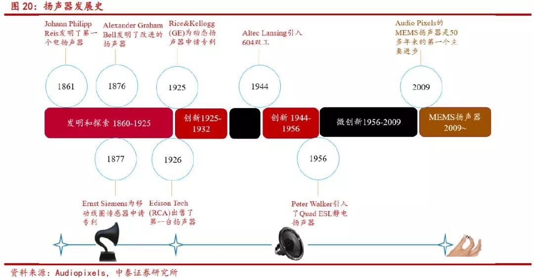 n 扬声器是声音传输的最后环节,也是音频系统最早被发明的环节。早在1860年代,第一个电扬声器就已经问世;到1950年代,扬声器结构基本稳定;进入2010年代,利用MEMS技术制造的扬声器开始被行业关注。