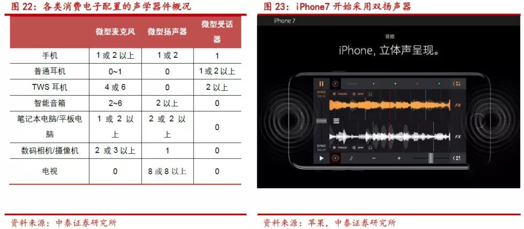 扬声器/受话器是消费电子的标准配置,单机使用量呈上升趋势。包括手机、笔记本电脑、耳机在内的消费电子产品,基本都配置有麦克风、扬声器或受话器,智能音箱等新兴应用搭载量更高。以手机为例,目前正发生从单扬声器到双扬声器配置的趋势,如iPhone从iPhone7开始采用双扬声器设计,安卓中高端也已经逐步普及,手机微型扬声器市场迎来较大的增量。