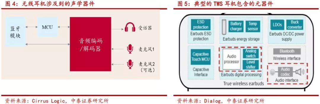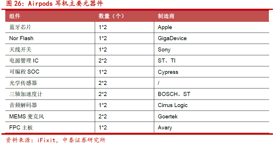 以Airpods为例,耳机端包含W1主芯片、蓝牙、存储、控制等芯片,也配备光学传感器、加速度计等传感器,声学器件则包括Cirrus Logic提供的音频解码器、歌尔股份的MEMS麦克风等。