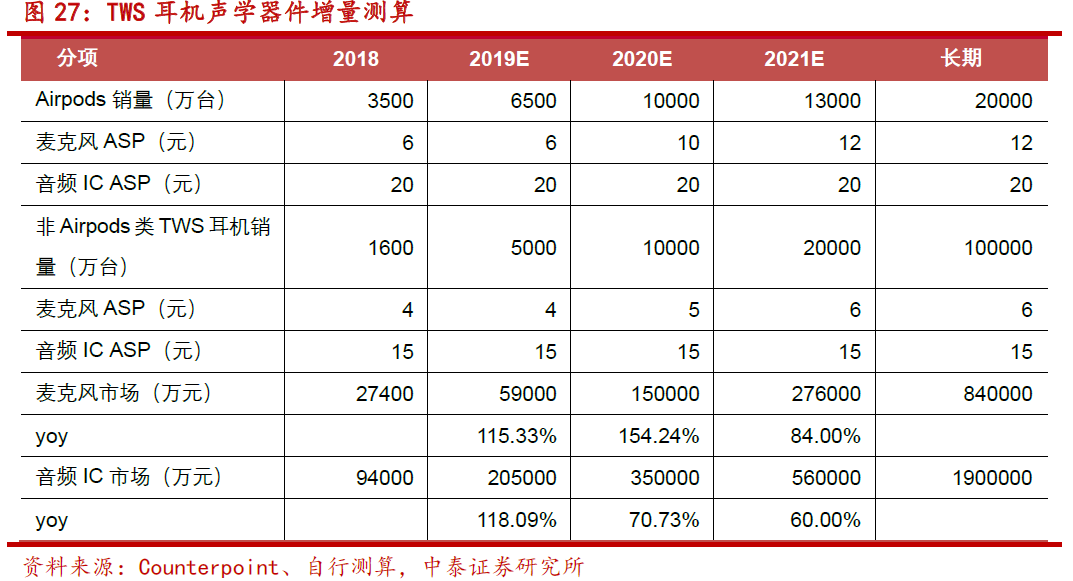 TWS耳机与智能音箱带来的声学器件增量测算。TWS耳机:我们预计2019年整体TWS耳机销量将达到1.1亿台,其中Airpods 6000台、非Airpods TWS 5000台;明年TWS耳机销量将达到2亿台,其中Airpods1亿台,非Airpods TWS 1亿台。在此假设下我们测算TWS今明两年麦克风市场规模将达到5.9亿/15亿,同比增速115.33%/154.24%,远期则有望达到84亿元;音频IC市场规模将达20.5亿/35亿,同比增速118.09%/70.73%,远期有望达到190亿元。智能音箱市场:我们预计2019年全球智能音箱市场销量1.2亿台,明年销量1.44亿台。在此假设下我们测算智能音箱今明两年麦克风市场将达到12亿/14.4亿;扬声器市场将达到36亿/43.2亿;音频IC市场将达到24亿/28.8亿。整体来看,TWS耳机与智能音箱将给声学器件市场带来较大的增长弹性。