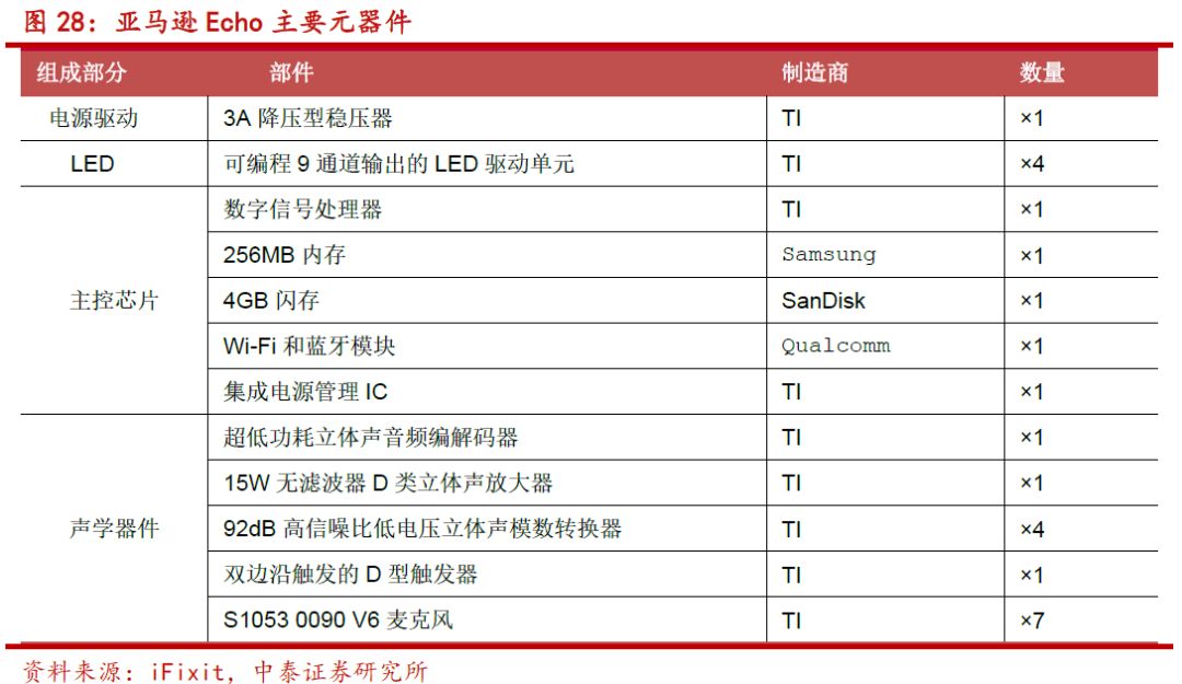 以亚马逊Echo为例,里面涉及到的声学器件包括TI 超低功耗立体声解码器、SNR低压立体声模数转换器、麦克风(7个)等。