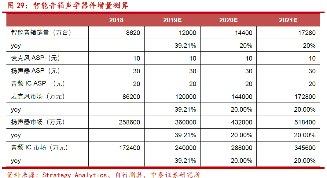 测算假设:我们估算智能音箱市场MEMS麦克风ASP为10元,扬声器(非微型)ASP为30元,音频IC ASP为20元;销量方面,根据Strategy Analytics的数据,2018年全球智能音箱出货量达到8610万台,我们预计今年将达到12000万台,明后年保持20%的增长。