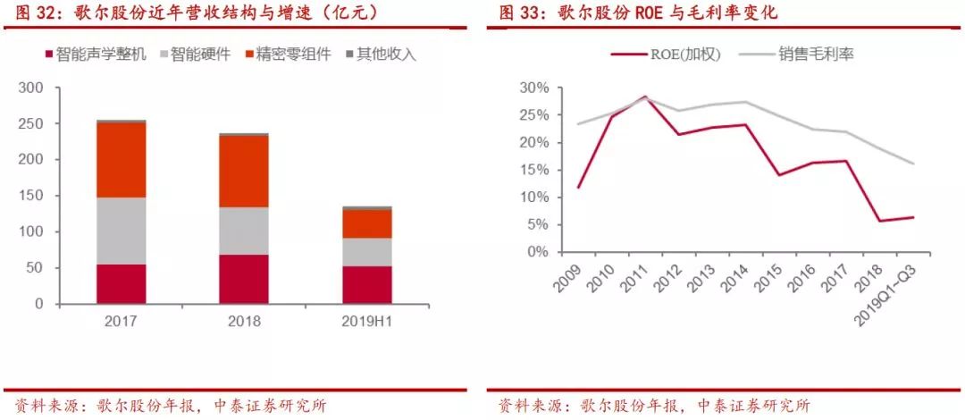2019H1因智能手机市场低迷,声学业务有所下滑。瑞声声学器件产品下游最大应用是智能手机,由于智能手机销量下滑及创新周期拉长等因素,公司今年声学器件业务量与价压力均较大,2019年上半年声学业务收入与毛利率分别下降15%和7.4个百分点,为36.5亿元和30.1%。公司预计下半年随着超线性产品的出货量与单价提升,声学业务将得到改善。