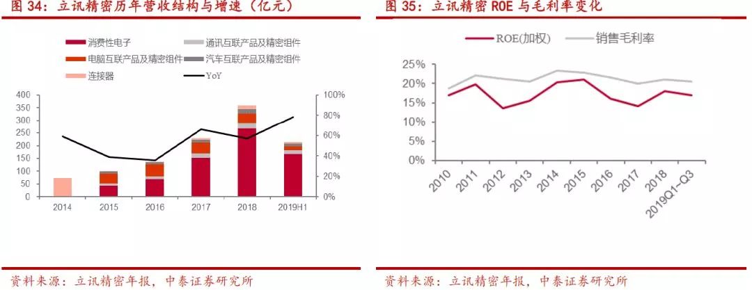 精密制造龙头,伴随大客户成长而壮大。公司于2004年成立,主要生产经营连接线、连接器、射频天线、声学、无线充电、马达、蓝牙耳机等零组件、模组与配件类产品,产品广泛应用于消费电子、电脑及周边、通讯、汽车及医疗等领域。从2010年上市至今,营业收入复合增速高达56%,归母净利润年复合增速高达48%,取得了令人瞩目的成长。其中一个重要原因就是公司以大客户为导向,跟随大客户的成长而壮大。
