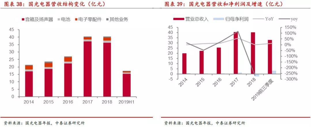 国光电器于 2010 年 5 月在深交所上市主营业务主要是音响电声类业务,包括多媒体类音响产品、消费类音响产品、专业类音响产品、通讯类音响产品、汽车扬声器以及扬声器配件的设计、生产和销售。2019年上半年,音响电声类业务实现营业收入161,216.18万元,占公司营业收入的比重为 92.88%。