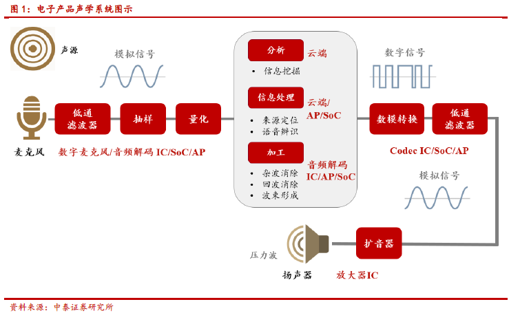 从采集到播放,人类实现对声音的再生产。声音作为自然界模拟信号的一种,是信息设备功能配置不可或缺的一环。电子产品中完整的声学系统包含三部分:①采集。主要由麦克风来实现。②处理。由各类音频IC或云端来实现,如ADC、DAC、音频编码器/解码器等。③播放。主要由音频放大器(属于音频IC)、扬声器来实现。其中最主要的元器件分别是麦克风、扬声器与音频IC。