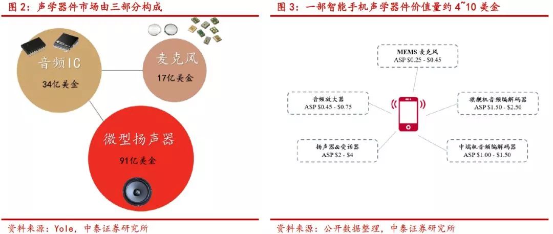 市场规模:微型扬声器市场规模最大(约91亿美金),音频IC其次(约34亿美金),麦克风市场最小(约17亿美金)。根据Yole的统计,2018年整体声学器件市场共约141亿美金,其中扬声器市场占比约65%、音频IC市场占比约24%、麦克风市场占比约12%。Yole预计整体市场在2024年将达到208亿美金,复合增速达到6.6%。