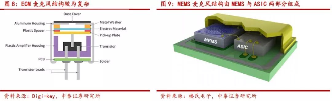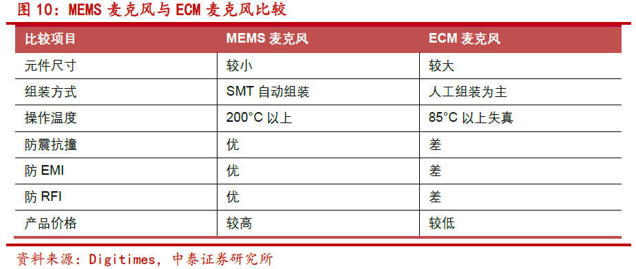 MEMS与ECM均是电容式结构,原理类似,只不过MEMS麦克风采用了半导体制程的芯片结构,由一个MEMS芯片与一个ASIC专用集成芯片构成。与ECM相比,MEMS麦克风尺寸较小、灵敏度高、信噪比高,有着良好的RF及EMI 抑制功能,同时与数字信号处理电路有着较好的适应性。制造方面,MEMS麦克风可以采用全自动SMT封装生产,效率大为提升,因此逐步替代ECM,在消费电子小型化浪潮下,成为行业主流。