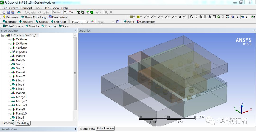 以某BGA封装器件热力仿真为例,本文通过CATIA进行实体建模(亦可为其它三维建模软件,或者采用ANSYS Workbench中的geometry建模),通过STP格式导入,模型如下: