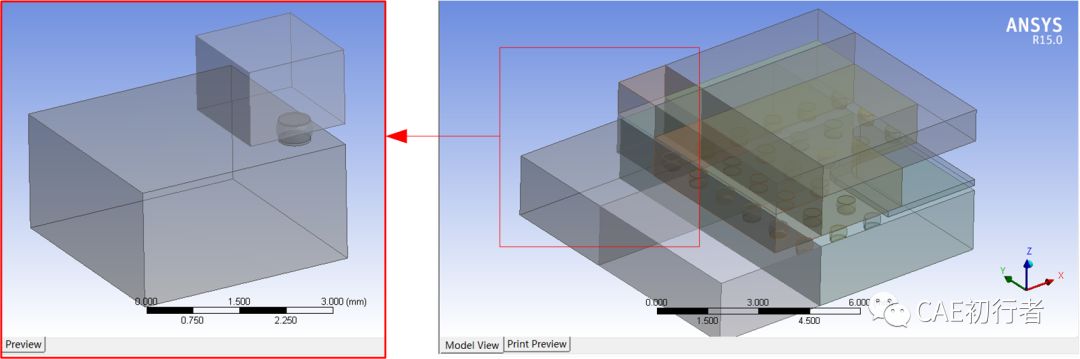 首先对求解工程进行复制,将求解结果传递至子模型工程中,点击进入子模型中的geometry进行编辑,切除掉其他区域,如图15。