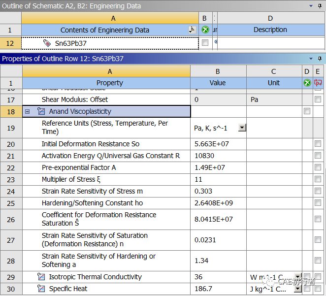 材料设置中,其它材料均采用线弹性,锡铅焊料采用粘塑性Anand模型,如图: