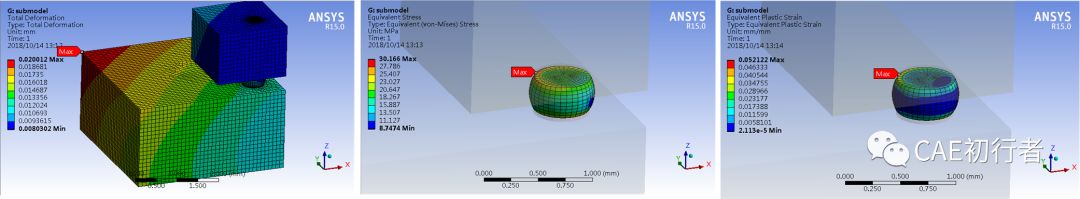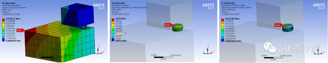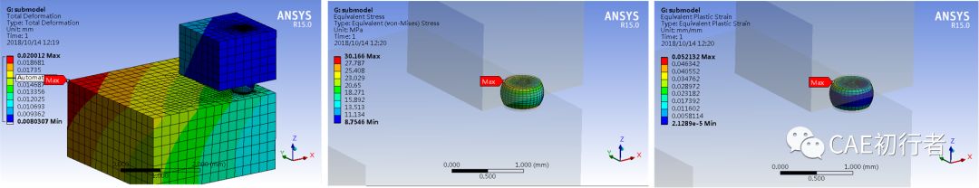 从第2节中求解结果可见,最边角处的焊点为危险点,采用子模型方法对其进行精确求解。