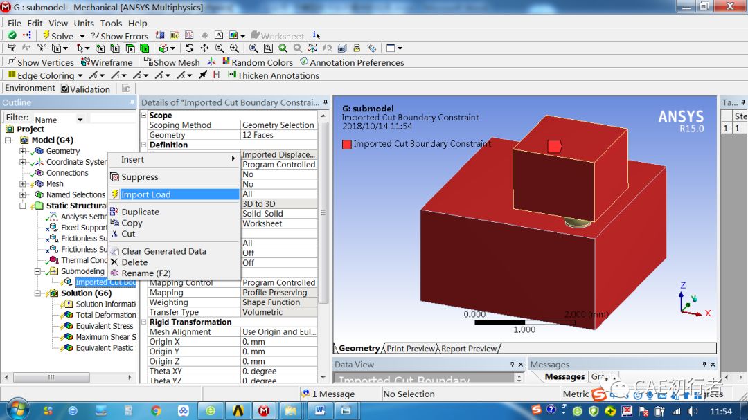 出现Imported Cut Boundary Constraint项,右键点击并选择Import Load,成功加载切割边界的位移约束。