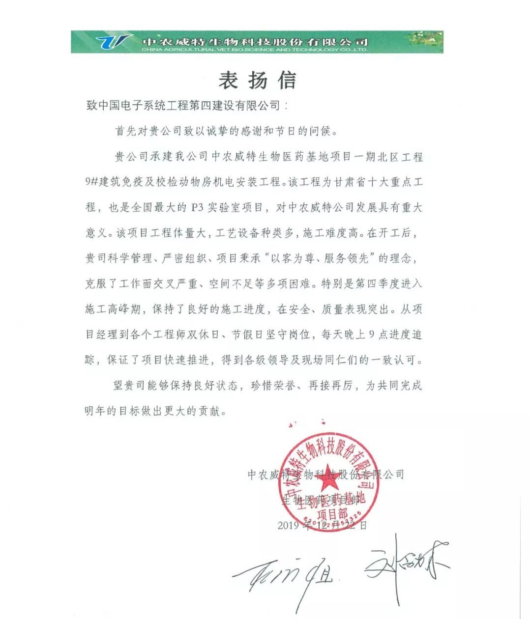 中农威特项目获业主表扬