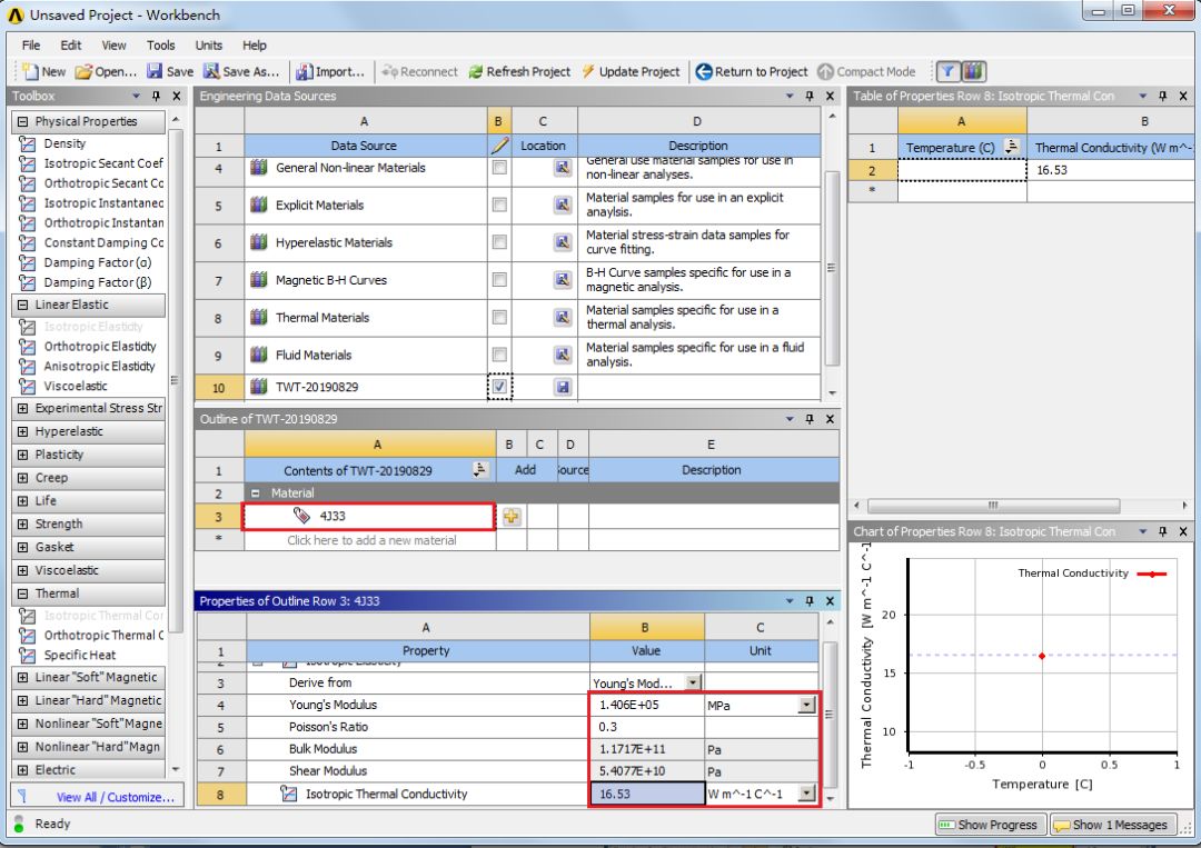 单击左侧工具栏“Toolbox”,为材料 4J33 添加材料参数,如弹性模量,热导率等,如图 8。
