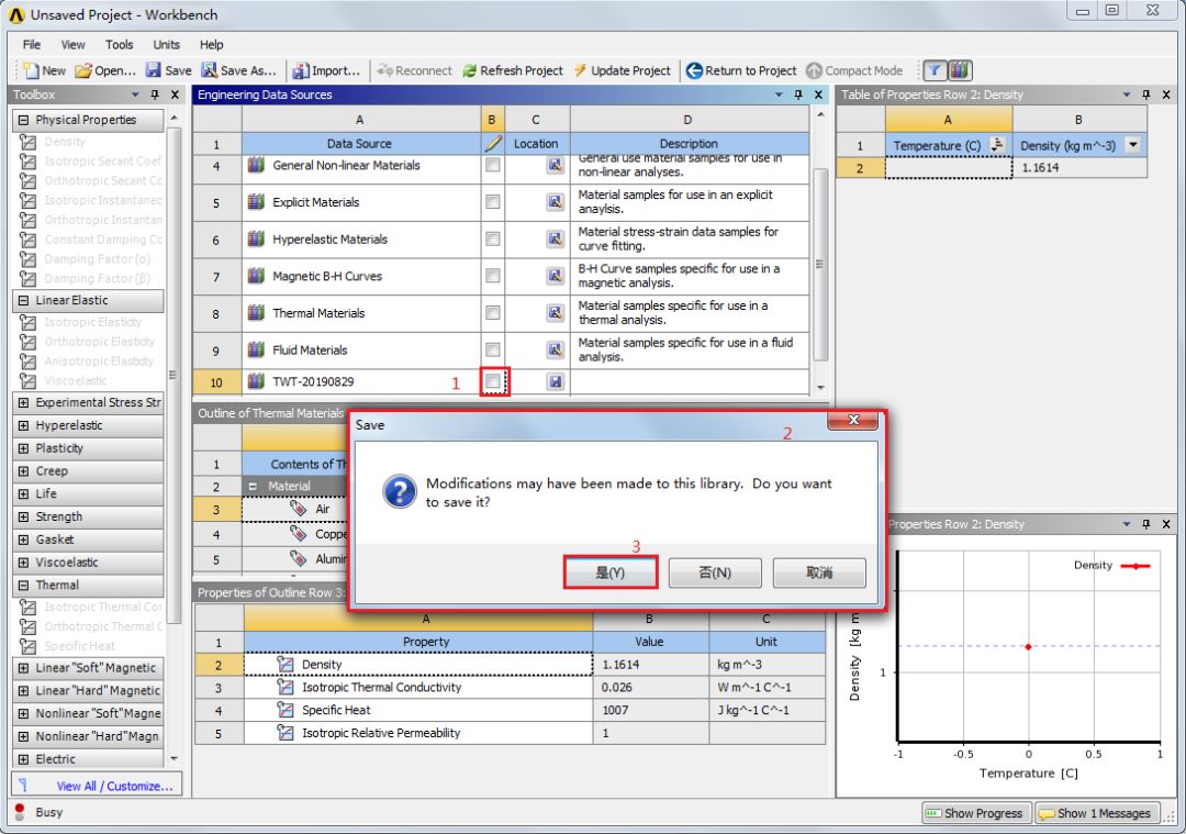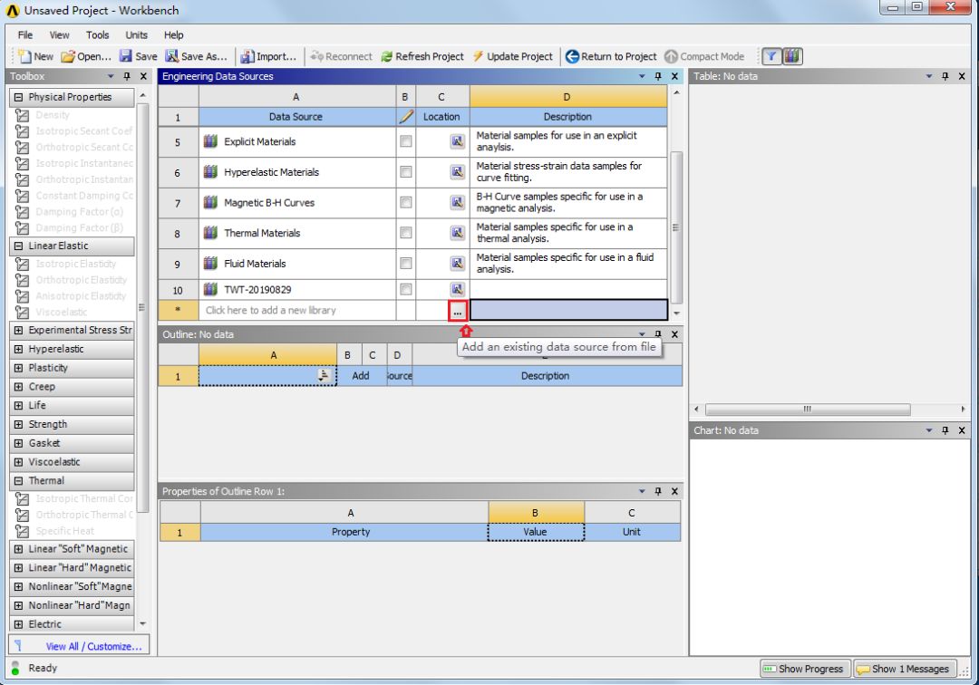 材料库中已经有部分材料库,进入 Engineering Data Sources 后,在 A 列中的红框“Click here to add a new library”,并输入自定义材料库的名称,比如“TWT-20190830”,如图 4。