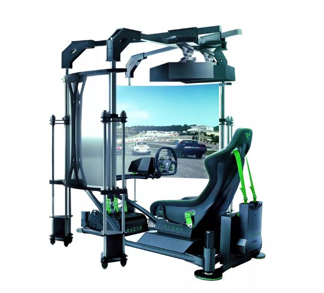 据雷蛇描述:“中心核心位于一个运动平台上,该运动平台由两个执行器和一个游戏控制箱提供动力,用于专业的赛车训练设置,可将地形表面,重力和声音映射为运动。” 同时,128英寸的弧形投影屏幕可提供202度的视野,并且在行驶时,单独的马达会收缩赛车安全带,从而模拟了在急转弯时的重力。