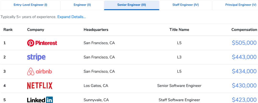 而工作经验在5年的程序员,拿到的薪资也很可观。如果被Pinterest聘用,最高可获得50.5万美元的报酬,其次是Stripe、Airbnb、Netflix、LinkedIn,从42.3万到44.3万美元不等。
