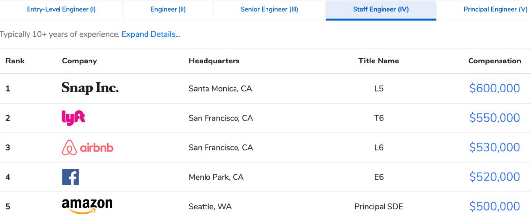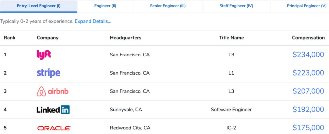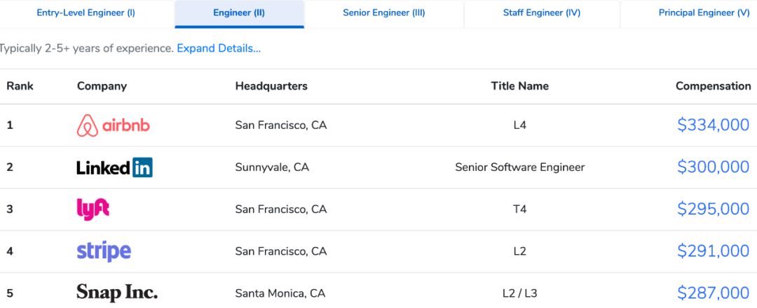 对于工作经验为2年到5年的程序员,可以从Aibnb、Linkedin、Lyft、Stripe、Snap拿到28.7万至33.4万美元的报酬。