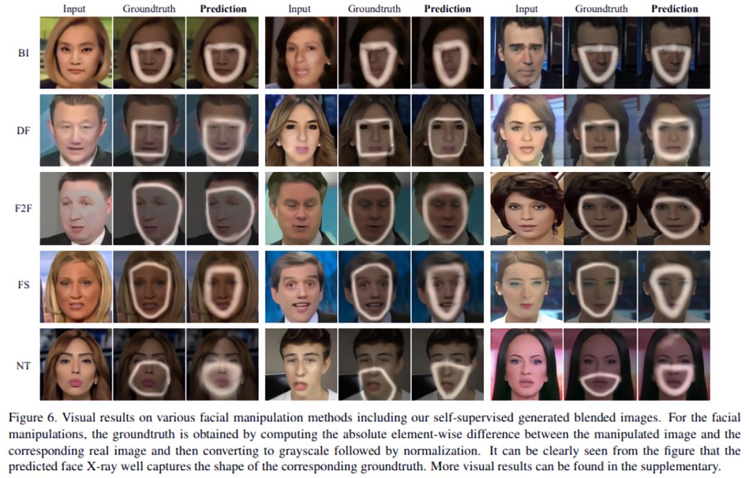 与FaceShifter不同的是,Face X-Ray能够检测出什么样的图片可能是伪造的。目前,大多数面部处理方法都是将改变过的面部混合到现有的背景图像中,每幅图像都有自己独特的标记,而Face X-Ray生成的灰度图像能够根据标记,显示给定的输入图像是否来自两个不同来源的图像。